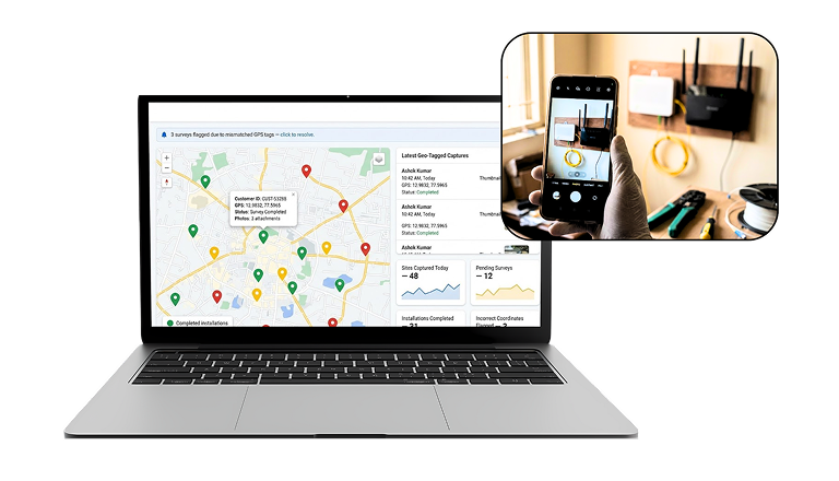 Capture accurate GPS coordinates, photos, and notes for surveys and installations directly from the field.